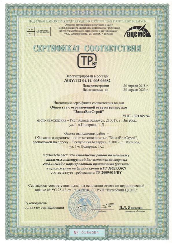 Сертификат соответствия - выполнению работ по монтажу стальных конструкций без выполнения сварных соединений с нормированной прочностью