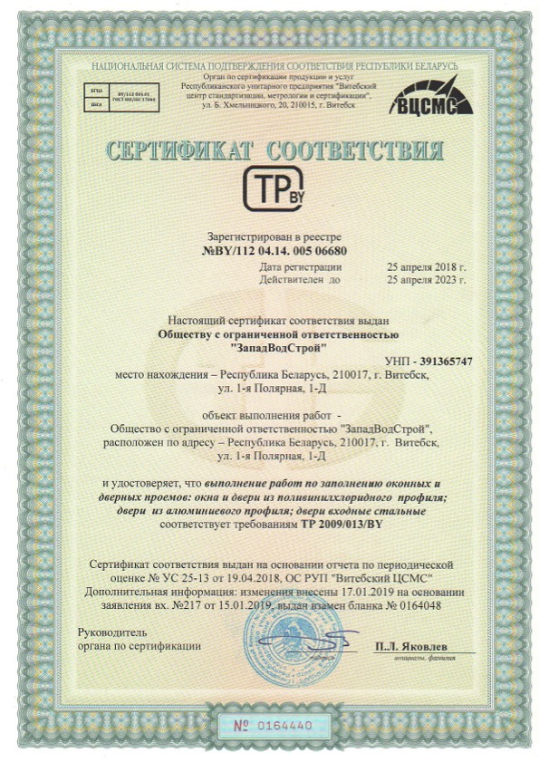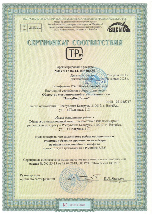 Сертификат соответствия - выполнение работ по заполнению оконных и дверных проемов: окна и двери из поливинилхлоридного профиля