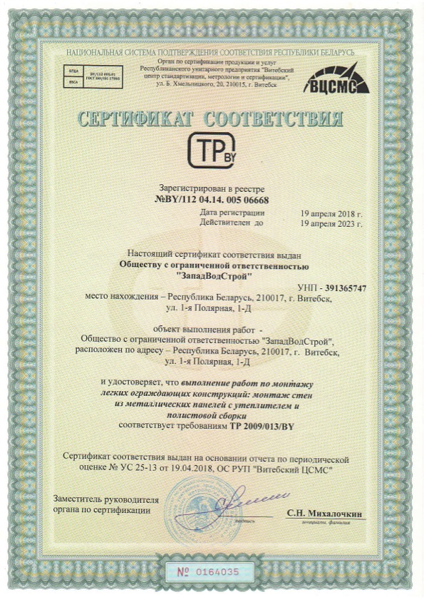 Сертификат соответствия - выполнение работ по монтажу лёгких ограждающих конструкций