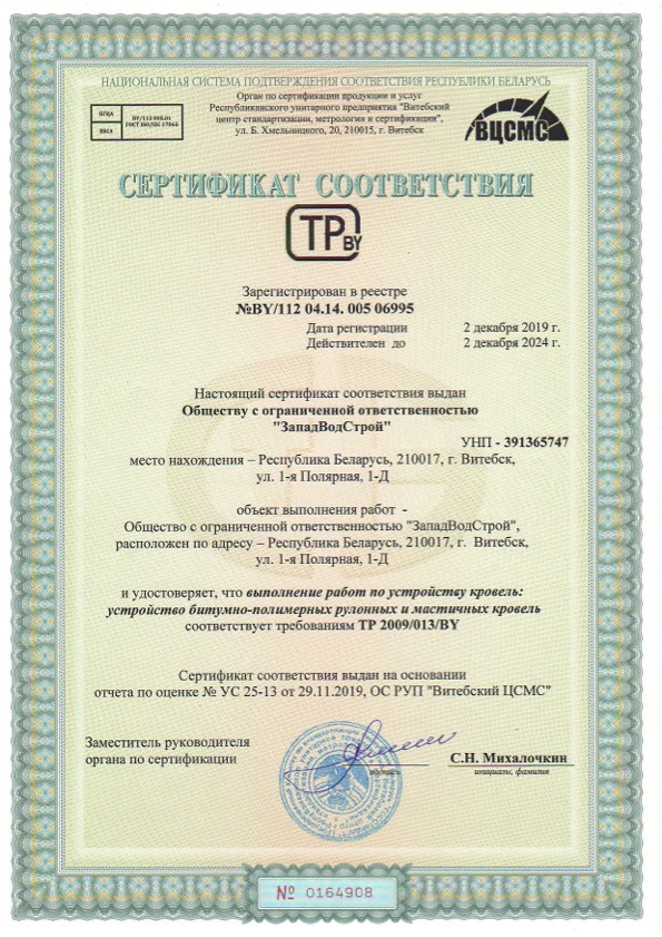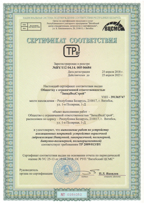 Сертификат соответствия - по выполнению работ по устройству изоляционных покрытий
