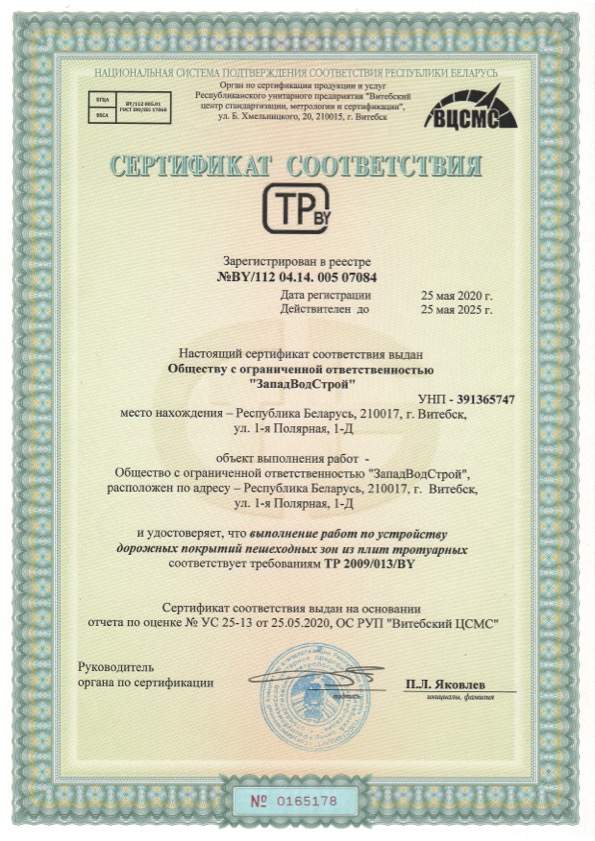 Сертификат соответствия - выполнение работ по устройству дорожных покрытий пешеходных зон из плит тротуарных
