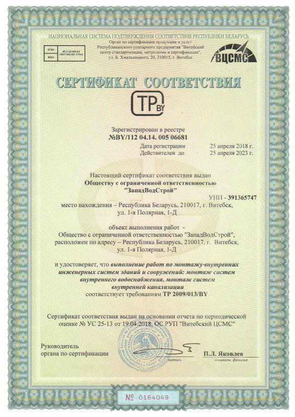 Сертификат соответствия - выполнение работ по монтажу-внутренних инженерных систем зданий и сооружений