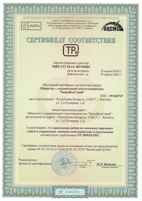 Сертификат соответствия - выполнение работ по монтажу наружных сетей и сооружений