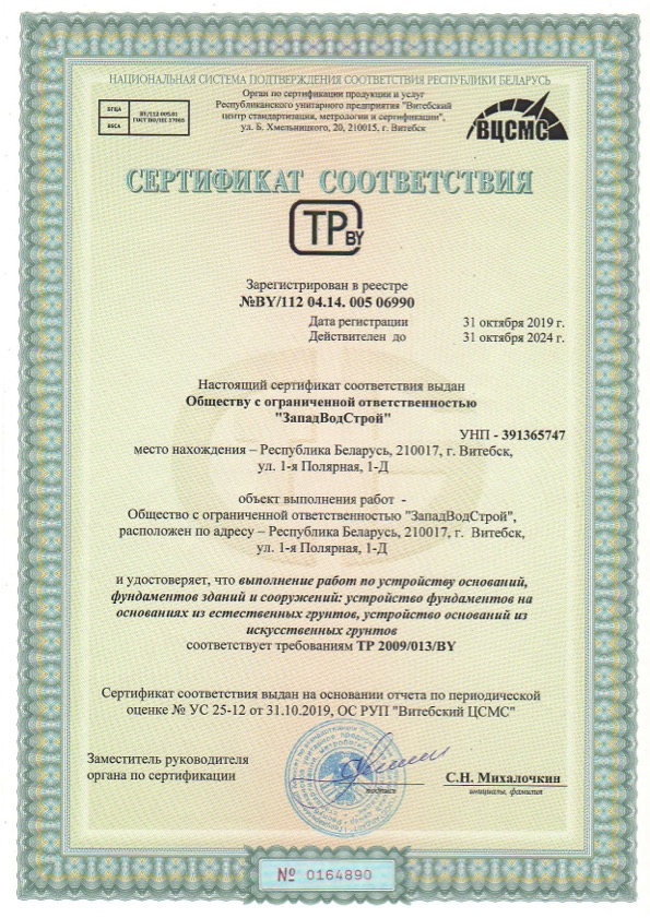 Сертификат соответствия - выполнение работ по устройству оснований, фундаментов зданий и сооружений